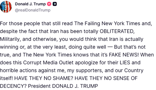 Trump did not add a statement to his post, seemingly letting the headline do the talking, though earlier in the day, he launched another tirade towards the New York Times.